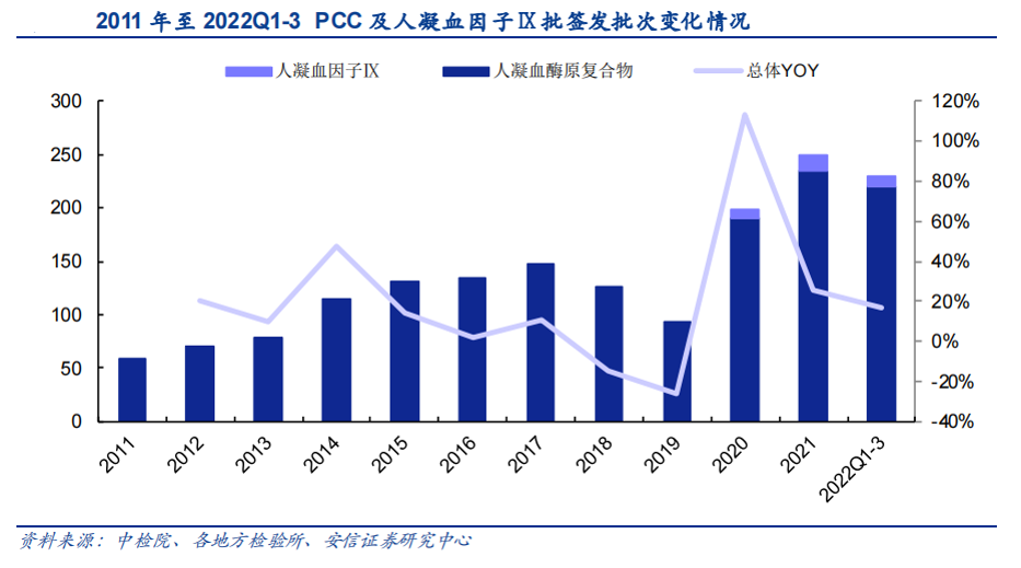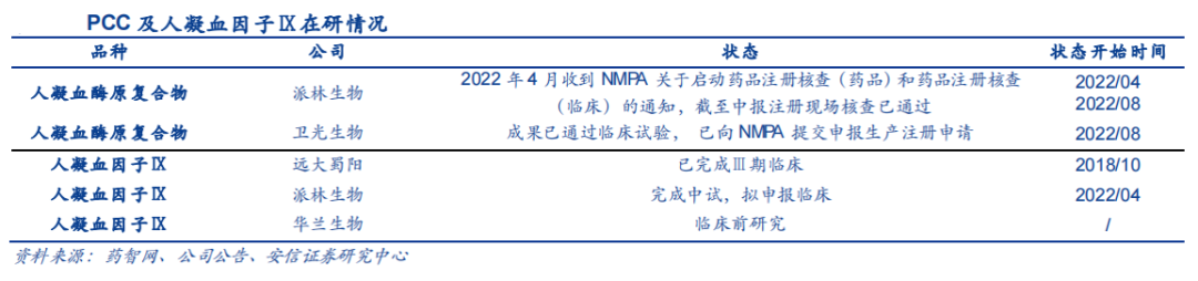 PCC市场主要参与者较少,人凝血因子Ⅸ仅一家获批。根据中检院及各地方检验所的数据,按批签发量口径,华兰生物、泰邦生物及上海新兴的PCC产品上市时间较早,在较长时间里占据主要的市场份额;从批签发批次的口径看,博雅生物与天坛生物的PCC产品获批后,批签发批次增长较快,在2022年Q1-3获得批签发的5家厂商中,博雅生物、华兰生物、泰邦生物、天坛生物占比位列前四,分别为32%、29%、17%和13%。人凝血因子Ⅸ方面,目前仅只有泰邦生物的产品于2020年7月获批上市。