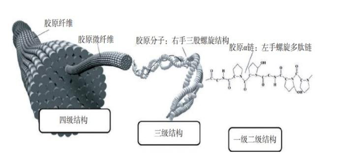 四级结构:原胶原首尾相接,按规则平行排列成束首尾错位,通过共价键搭接交联,形成稳定的胶原微纤维,并进一步聚集成束,形成胶原纤维。