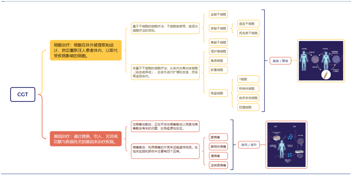 细胞基因治疗(CGT,Cellular and Gene Therapy)是目前生物医药领域最具前景的发展方向。CGT疗法是继小分子、大分子靶向疗法之后的新一代精准疗法,引领生物制药的新一轮浪潮。CGT是指利用基因表达和体外改造等手段,将确定的遗传物质转移至患者的特定靶细胞内,通过基因添加、基因修正、基因沉默等方式修饰个体基因的表达或修复异常基因,进而实现治疗的方法具体分为细胞治疗和基因治疗。
