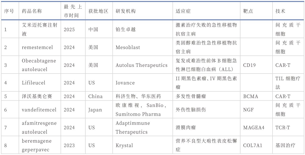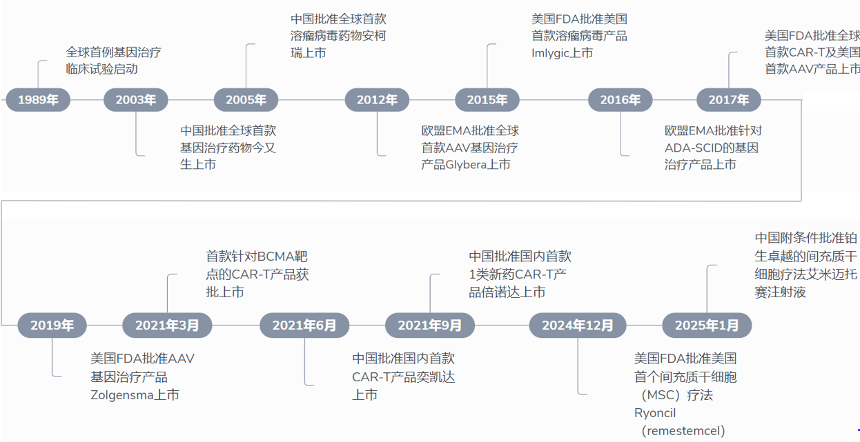 2019年以来,国内基因治疗行业加快发展,CAR-T产品、溶瘤病毒产品、AAV产品等基因治疗临床试验持续增加,NMPA亦于 2021年6月和9月批准中国首款CAR-T产品奕凯达,以及中国首个1类新药CAR-T产品倍诺达®。2024年 12月首个获 FDA批准的间充质干细胞(MSC)疗法Ryoncil(remestemcel)上市。2025年1月中国附条件批准铂生卓越的间充质干细胞疗法艾米迈托赛注射液。