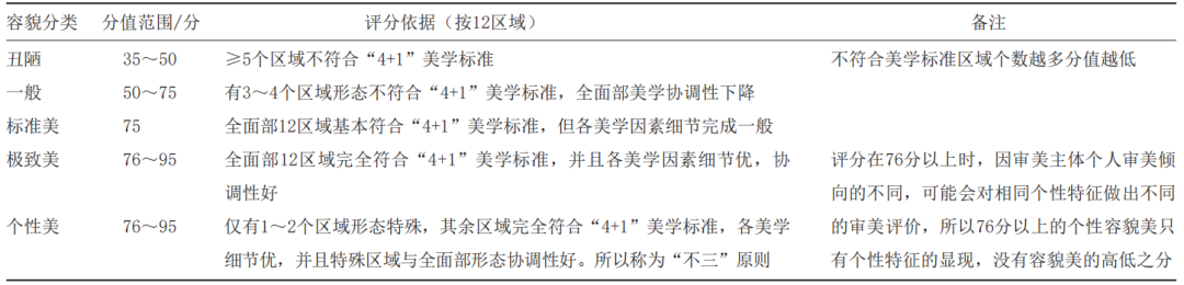 具体而言,面部容貌美度是对面部整体与局部形态符合“4+1”美学标准的程度,以及各区域间美学协调性的综合评估。笔者将东方女性此分值范围界定为35~95分。其中,将全面部12个大区(额、颞、眉、眼、鼻、唇、颏、眶下、颧、颧弓下、下颌、颌下区)形态基本符合“4+1”标准的面容定义为“标准美”,设定基准分为75分。若各区域形态细节完全契合理想美学且整体协调性极佳,则可评为“极致美”,分值达95分。而在标准美基础上,兼具少数个性特征并保持全面部协调者,则定义为“个性美”,分值范围为76~95分。