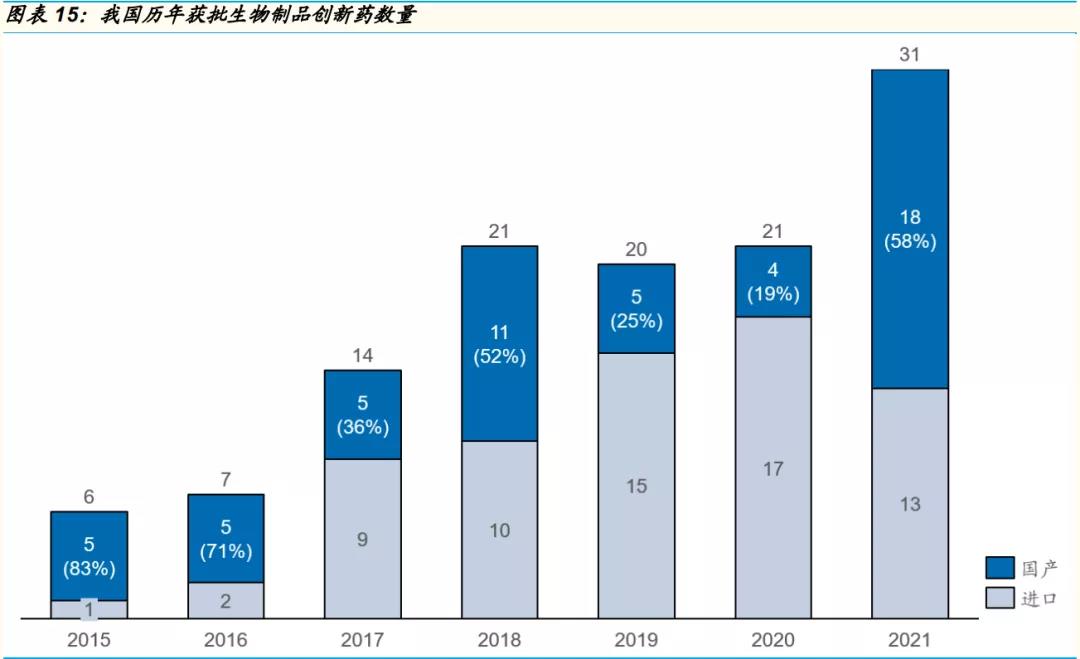 2021年共有31款生物制品获批,涉及多个疾病领域,如:抗肿瘤、血友病以及新冠等。其中, 共有18个国产药获批,占比58%。我们认为,在新冠疫情流行的大背景下,疫苗作为构筑免疫屏障的第一道防线,未来将和中和抗体、小分子口服药一起发挥作用,共同抗击疫情。因此,我们看好新冠疫苗、小分子以及中和抗体的潜力以及其产业链的投资机遇。