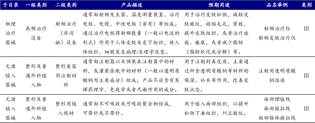 《医疗器械分类目录》调整,“水光针”等医美产品被纳入III类医疗器械管理。3月30日,国家药监局调整《医疗器械分类目录》(下简称《目录》),其中涉及医疗美容领域的调整内容包括: