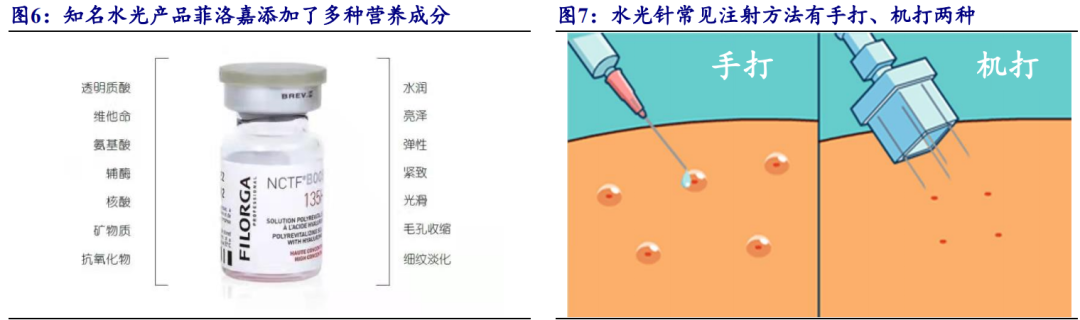 “水光针”通常是指代一类以无交联或低交联小分子透明质酸钠为主要成分,并添加维生素、氨基酸、矿物质等多种成分的复合溶液。其中,透明质酸钠主要起补水、保湿作用,其余成分则用于满足美白、抗衰、除皱等需求。“水光针”需注射至真皮层内才能起到治疗效果,常见注射方法有手打、机打两种:手打水光可根据实际情况控制深浅,但依赖医生操作技术;机打水光给药均匀、力度平稳,但易造成漏液浪费。水光针效果可维持 3-6个月,因此水光针消费者通常一年内会购买 2-3 次。