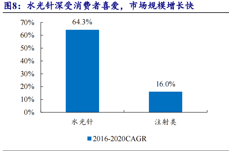 水光针由于价格低、功效多样、恢复期短,长期以来深受消费者喜爱。根据亿渡数据,我国水光针项目市场规模2016-2020年复合增速达到 64.3%,远超注射类医美项目整体增速(仅16.0%)。但目前水光针市场存在大量不合规现象:一方面,多数用于注射的产品均未取得III类医疗器械注册证,例如,知名水光产品实际为妆字号,按规定仅能用于涂抹,不能用于注射;另一方面,由于水光针操作简单,很多未持有医疗机构执业许可证的美容院也可能为了牟利违规操作注射,带来较大安全隐患。