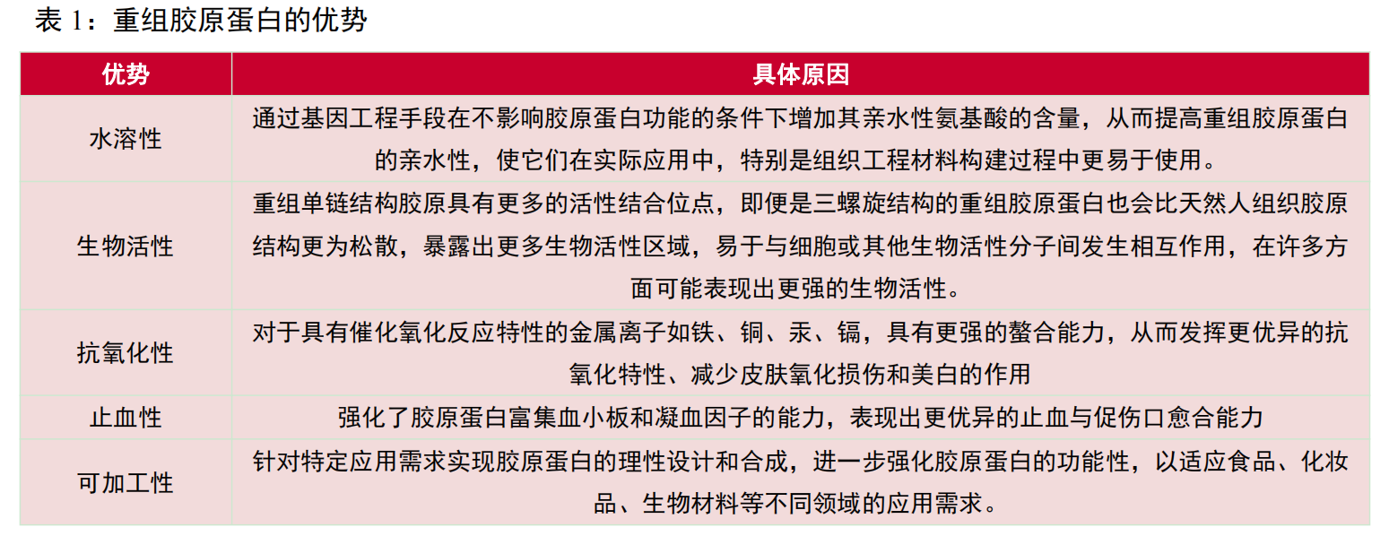 重组胶原蛋白在生物医学领域具备比较优势,更具前景。重组胶原蛋白广泛应用于医疗健康、皮肤护理、食品等领域,比起动物源胶原蛋白,“合成生物学技术”生产的重组胶原蛋白克服了传统动物胶原蛋白可能存在的病毒隐患、排异反应风险、功能性、吸收性不确定等多重弊端,具有良好的生物相容性和安全性以及很低的抗原性,因而可以广泛应用于生物医学领域,包括医用敷料、人工骨支架、注射填充物、人工血管等。