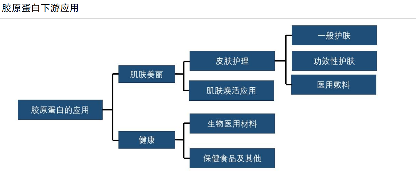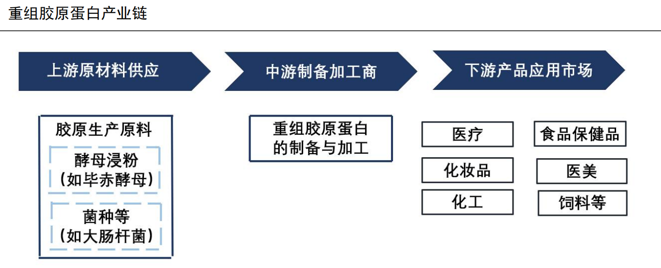 重组胶原蛋白原材料成本低,中游厂商具备较高的收益。重组胶原蛋白产业链上游为胶原生产原料供应商,其中重组胶原蛋白的原料主要来自微生物发酵企业所生产的毕赤酵母和大肠杆菌等菌种。中游为重组胶原蛋白的制备与加工,其中重组胶原蛋白厂商的生产设备等固定成本较高,原材料等可变成本较低,同时中游厂商的收益较高。