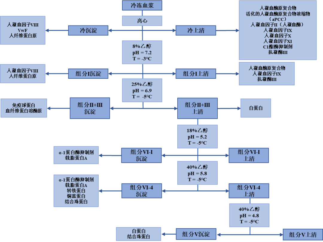 血浆蛋白制备技术始于Cohn教授创立的低温乙醇法。20世纪70年代,柱层析法被引入血浆蛋白分离。20世纪90年代起,血液制品的生产以低温乙醇法为主,同时结合柱层析法来规模化生产多种血液制品。层析法弥补了低温乙醇法分离时间长、纯度低、产品种类少和自动化程度低等不足,增加了回收率,提高了血浆利用率。