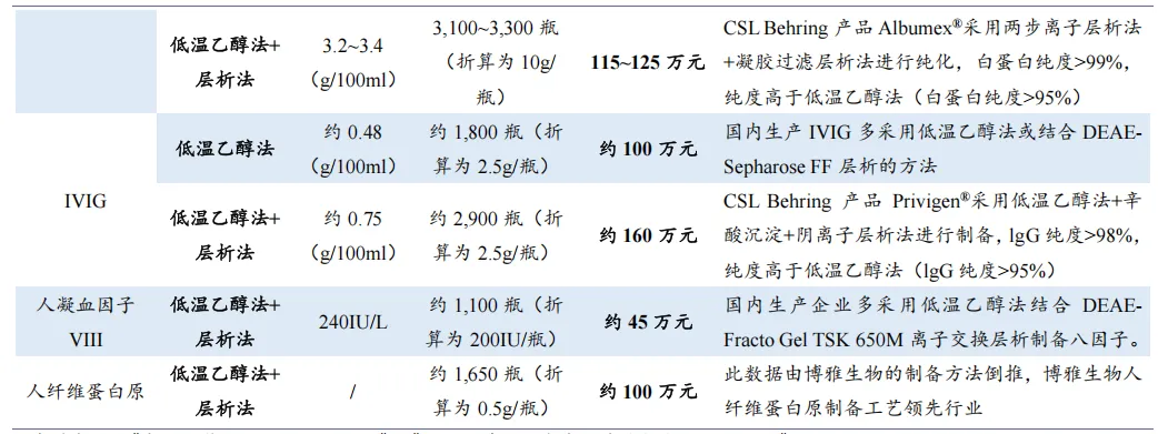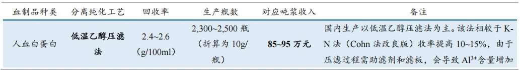 血制品在不同分离纯化工艺下的收率及对应吨浆收入估算