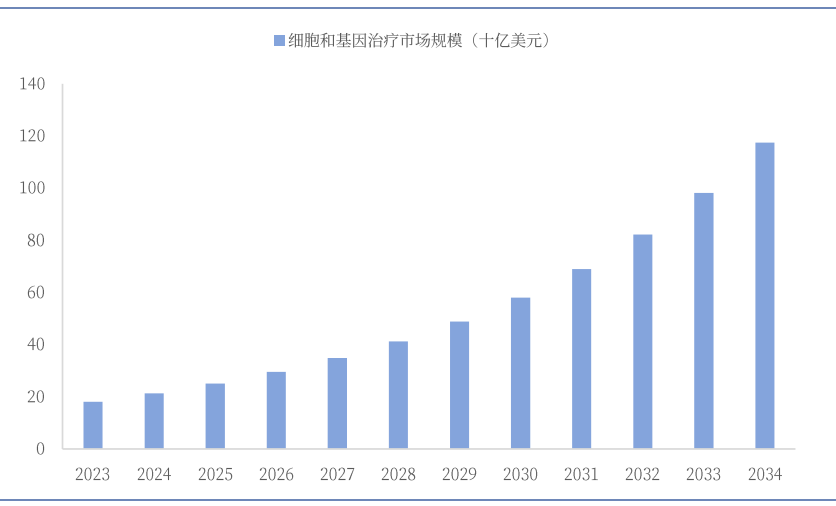 根据Precedence Research预测,2024年全球细胞和基因治疗市场规模为212.8亿美元,预计到2034年将达到1174.6亿美元左右,从2024年到 2034年的复合年增长率为18.6%。其中,2023年北美细胞和基因治疗市场规模约为90亿美元,占比约50%。
