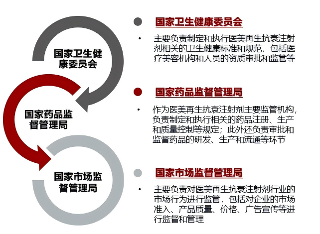国家卫生健康委员会、国家药品监督管理局以及市场监管总局,共同构成了中国医美再生抗衰注射剂行业的核心监管机构体系,从基础法规、研发注册、生产、销售宣传到产品使用各环节形成了监督管理的闭环。