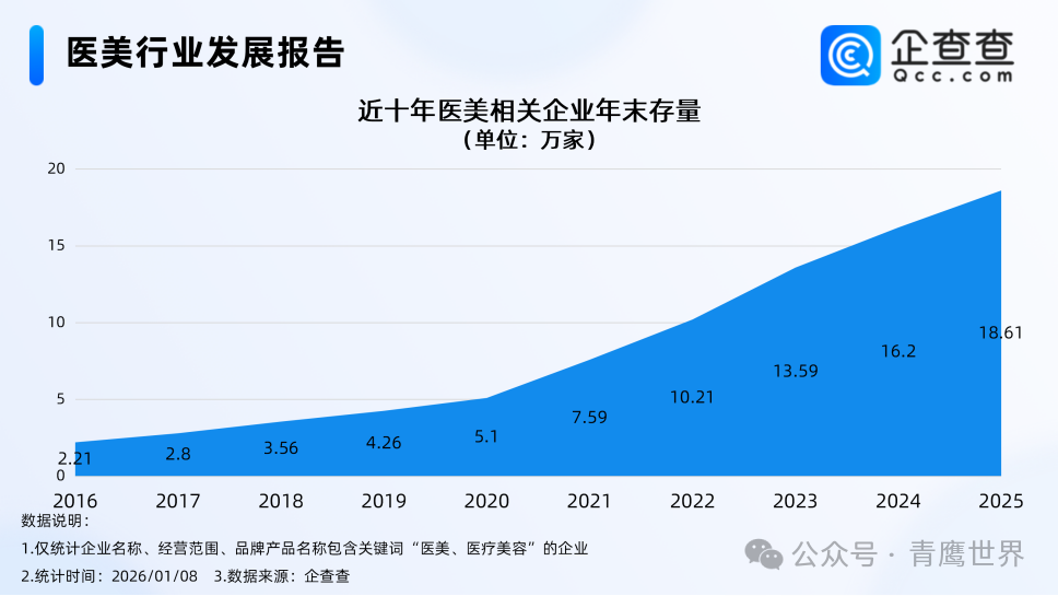 中商情报网指出,近十年美容产业的相关企业注册量呈持续正增长态势。企查查数据也指出,从2016年的2.21万家到2025年的18.61万家,实现了9倍以上的增长。每年以10%甚至30%的增长发展,尤其从2021年(突增199.58%)后,医美企业的注册增长更加迅猛发展。