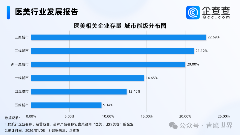企查查数据显示,截至1月8日,我国目前现存医美企业达到18.69万家。其中,成立3年的企业已经超过50%,成立1-3年的占比38.7%,三线城市占比达到22.69%,二线城市、新一线城市的医美相关企业分别占比21.12%、20.00%。